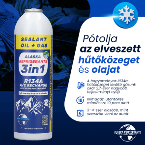 • Egy palack 3in1 HC134a Alaska Refrigerants hűtőközeg 500 g R134a típusú gáznak felel meg, egy palack +25% HC134a 621 g R134a típusú gáznak felel meg.